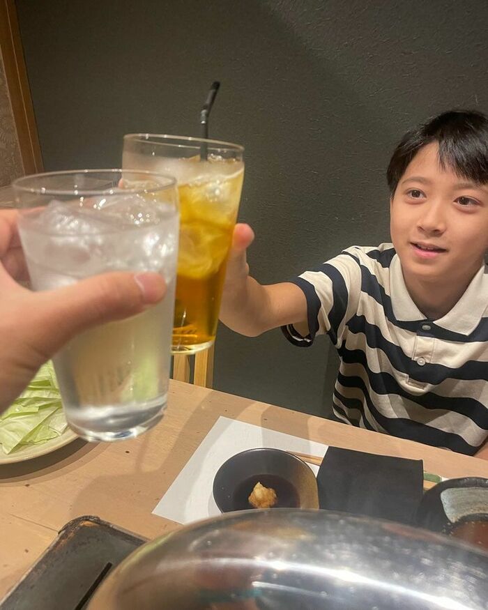 2024年10月には、ボーダーシャツを着た新之助さんと向かい合わせに座り、ともに乾杯する様子も。新之助さんの表情はどこかうれしそうですね。
