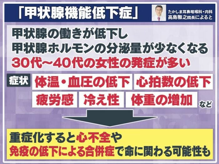 たかしま耳鼻咽喉科・内科高島雅之院長によると、「甲状腺機能低下症」とは、甲状腺の働きが低下し、甲状腺ホルモンの分泌量が少なくなる病気で、30代~40代の女性の発症が多いということです。