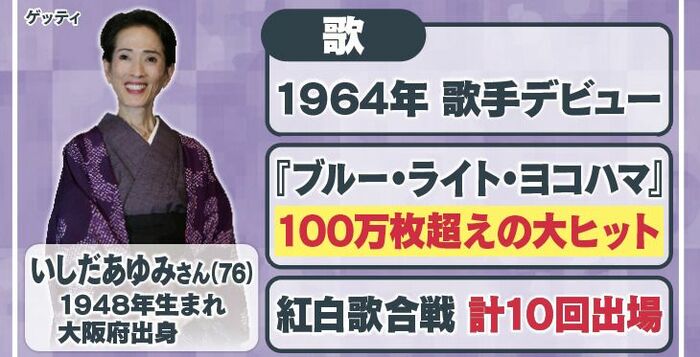 いしださんは1968年、20歳の時に発売された「ブルー・ライト・ヨコハマ」が100万枚を超える大ヒットを記録。