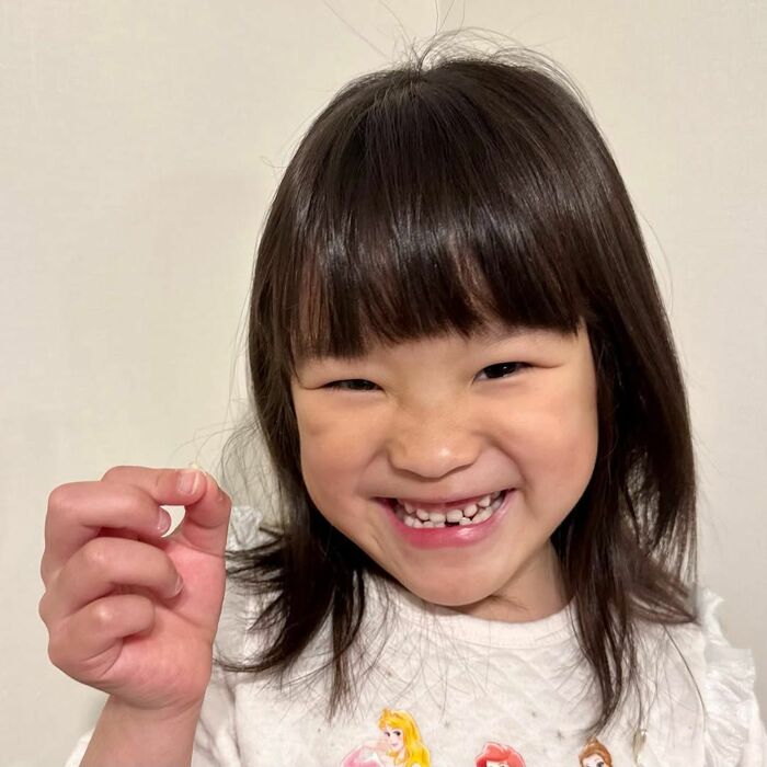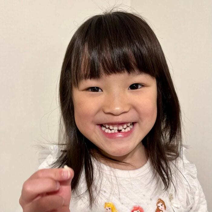 写真には、うれしそうな表情で抜けた歯を手に持ち、カメラに見せるようなポーズをするののちゃんが!「にー」っと笑う口元を見てみると、下の前歯が1本ありませんね!