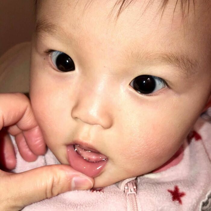 クリクリの大きな瞳が印象的なののちゃん。かわいらしい表情にくぎ付けになってしましますが、口元に注目してみると乳歯はまだ生えていないように見えます。