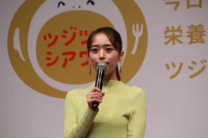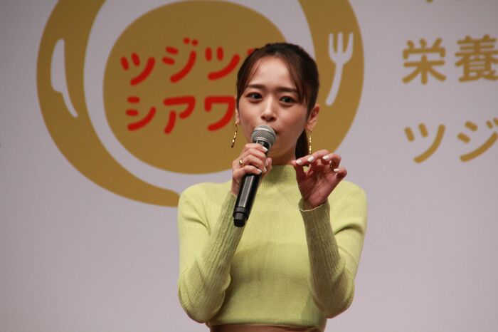 イエローのシャツに上下ベージュのセットアップ姿で登場した速水さんは「ツジツマシアワセⓇ」について、「体と相談しながら食事をとることで、ストレスなく健康にもつながると思います」と魅力を語っています。