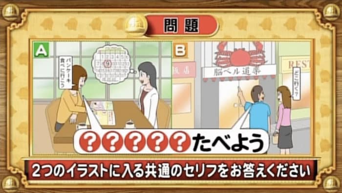 「?????たべよう」。2つのイラストに入る共通のセリフを答えてください。