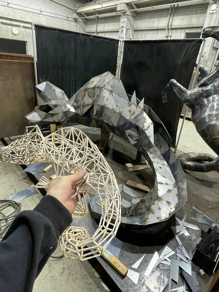 一連の工程の中で苦労した点をうかがうと、「周りの風景に同化するようにポリゴン状の形態で制作したことが苦労しました。」と、話してくれた菊地さん。