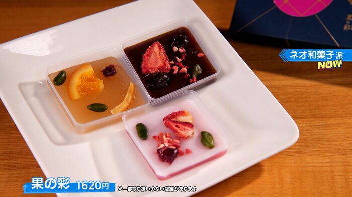 3色のカラフルなようかんにドライフルーツやナッツなどを乗せた色鮮やかなネオ和菓子「果の彩(1620円)」