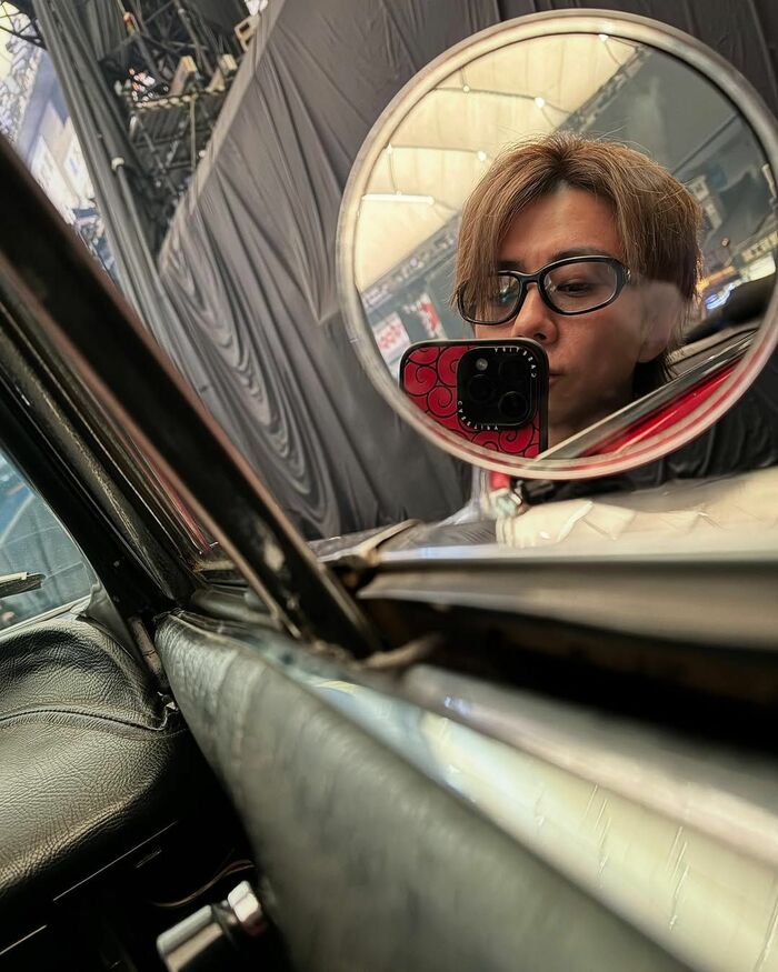 他にも、コンサートで乗る車なのか、車内から丸いサイドミラーに写る自身の姿を撮影したショットも公開した北山さん。