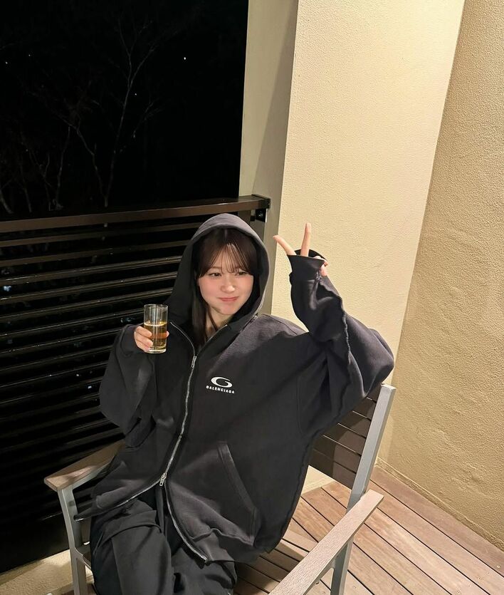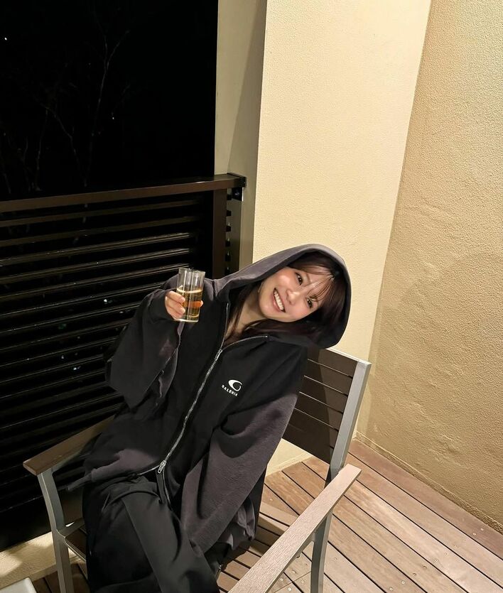 投稿された写真には、ダークグレーのパーカーに黒のゆったりとしたパンツ姿の生見さんが、ウッド調のベランダのような空間で椅子に座りながら右手にビールが入ったグラスを持っている様子が!