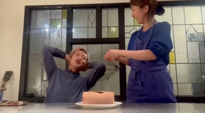 「娘につづいて、こんどは妻がケーキ買って来てくれた」とつづりアップされた今回の動画。エプロンをつけた奥さんがケーキにつけるろうそくを用意していると…。