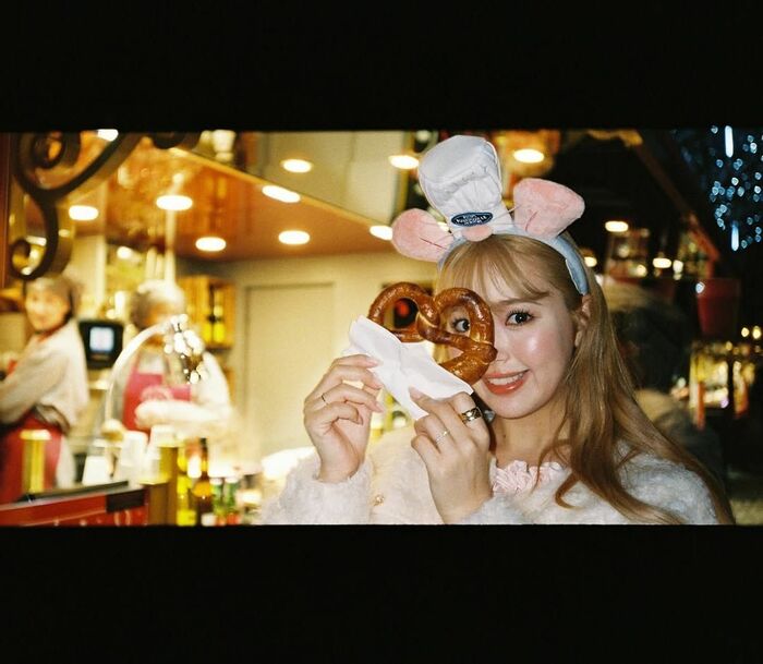 他にも、ディズニーランド・パリで売られているカチューシャをつけた藤田さんがプレッツェルの穴から覗きこむショットや…