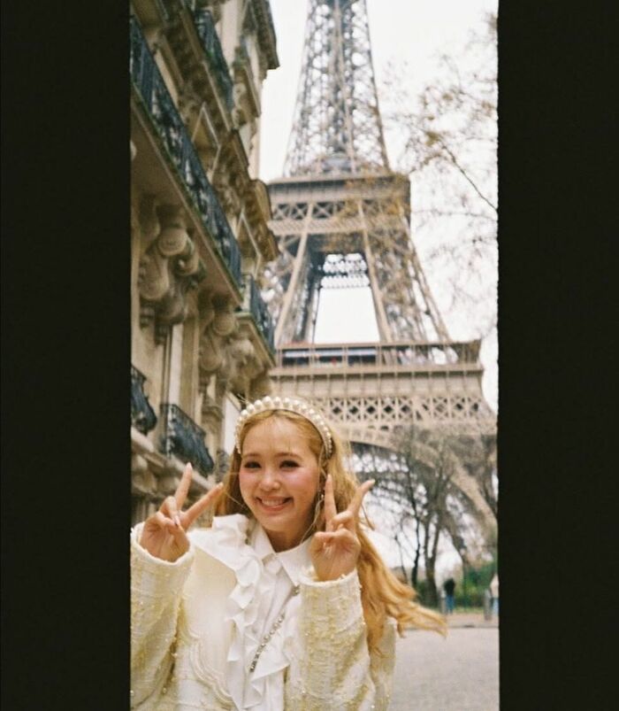 白色の“お嬢様コーデ”でエッフェル塔のふもとで楽しそうにピースする姿など、パリを感じるスポットでのオフショットを披露しました。