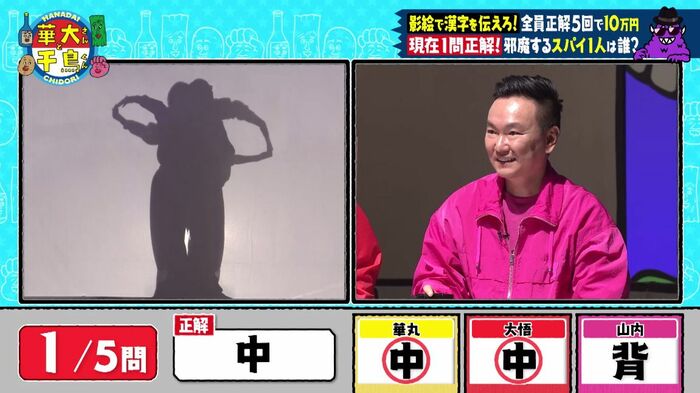 「竹」を「北」と答えた若槻さん(大吉さんとノブさんは正解)、柴田さんと若槻さんが見事な結束力で作った「中」を「背」と答えた山内さん(華丸さんと大悟さんは正解)もスパイ容疑者となりました。