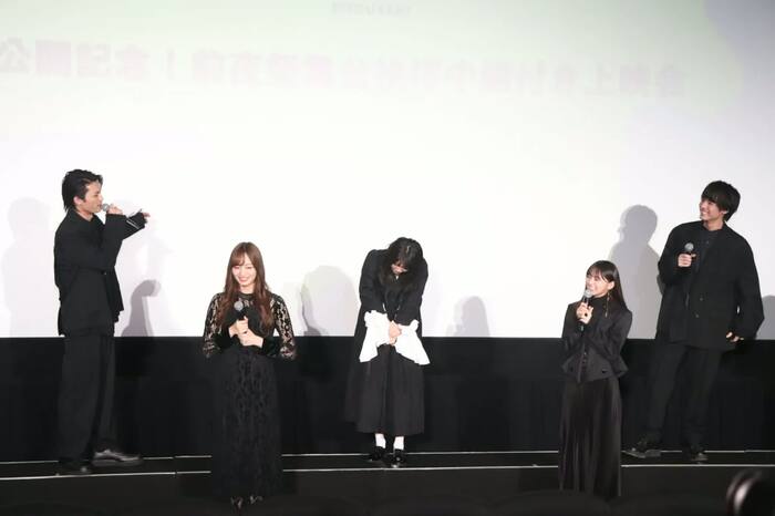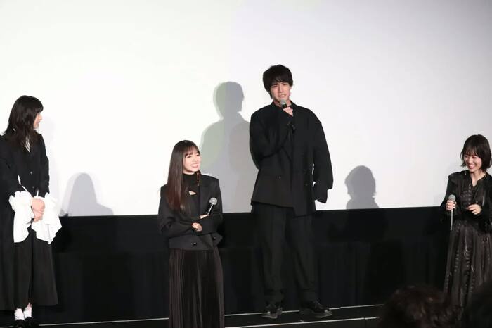 山下は「ようやく皆さまに観ていただけるということでドキドキしてます」とはにかみ、梅澤は「やっとお届けできて、すごくうれしい。今日は距離が離れていますが、身近に感じてもらえるように楽しい時間にできたらと」と中継先の映画館で観ている観客に呼びかけた。