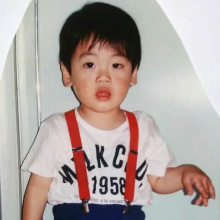 白いTシャツに赤いサスペンダーをつけた幼少期のおばたのお兄さんが、カメラをじっと見つめるほほ笑ましい姿が。