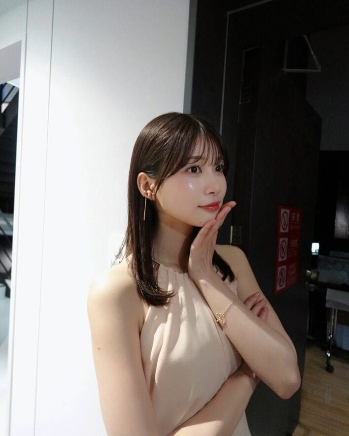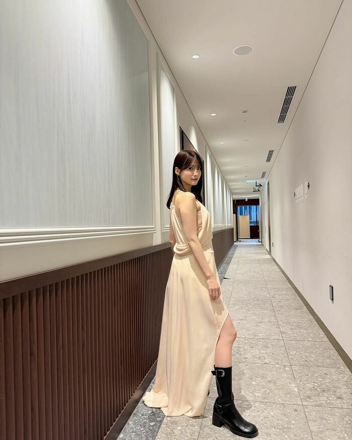 全身ショットでは、ピシッと背筋を伸ばして立ち、ワンピースに大きく入ったスリットからチラッと足を見せる様子も公開されています。じっとこちらを見つめる姿に照れてしまいそうですね!