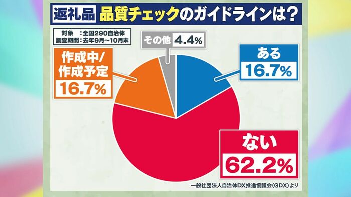 一般社団法人自治体DX推進協議会(GDX)によると、全国290の自治体を対処としたアンケートで、返礼品の品質チェックに関するガイドラインが「ない」と回答した自治体が62.2%に上り、明確な品質管理基準が整備できていない状況が浮き彫りになっています。