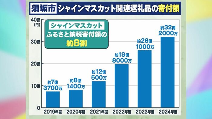 長野県須坂市の「ふるさと納税」の寄付の中で、シャインマスカット関連の返礼品に対する寄付額は、年々右肩上がりに増加しており、2024年は約32億円2000万円。