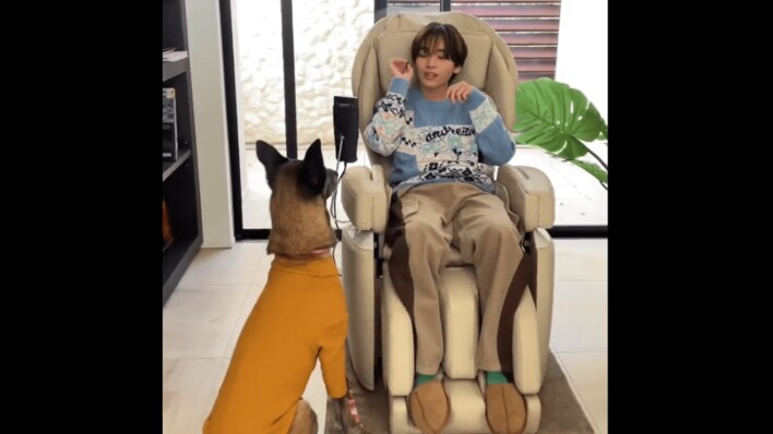 宮世さんは、マッサージチェアに体がすっぽりはまるように座ってリラックした様子です。その手には、犬のおやつと思われるものが。