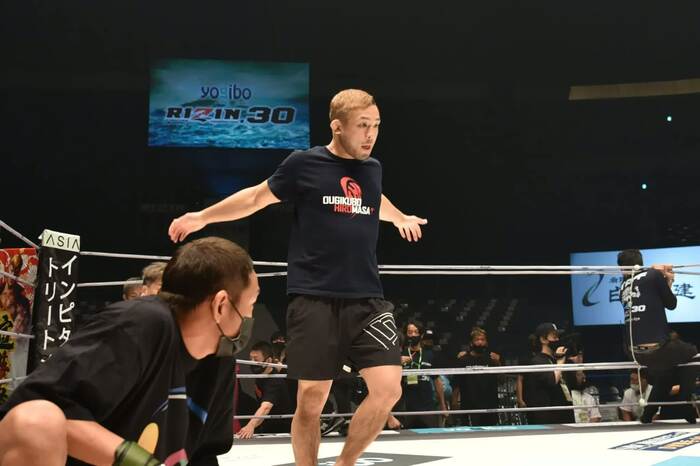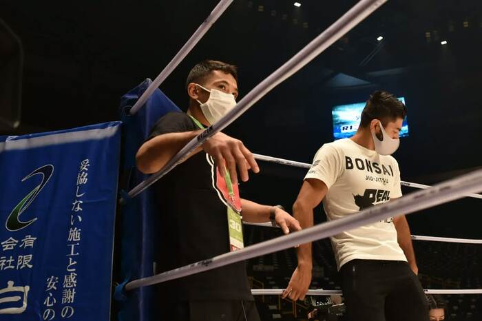 対戦するアラン“ヒロ”ヤマニハ選手は、ボンサイ柔術のホベルト・サトシ・ソウザ選手(RIZINライト級初代王者)とリングチェックに登場。あまり動き回ることはせずに、リングの固さなどを確認。ふたりで少し話した後チェックを終えた。フジテレビュー!!がヤマニハ選手に話を聞くと「あと、もう少しで僕の夢が叶います。試合自体が楽しみでうれしいです。きっといい試合になると思います」と語った。リングの状態について聞くと「やわらかいと思いましたが、これくらいの方がやりやすいですね」と笑顔を見せた。