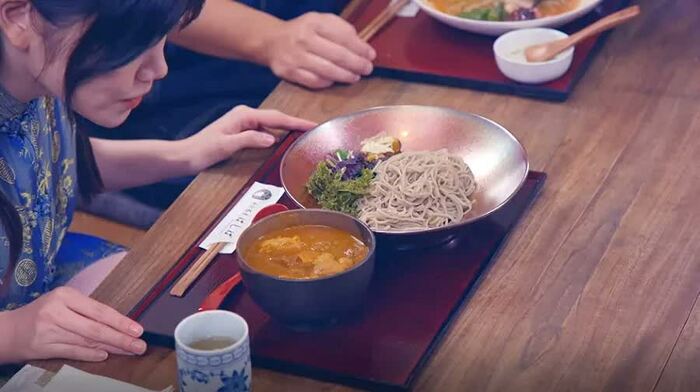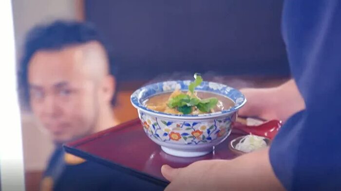 オマリーさん:お待たせしました。鶏肉と冬瓜のスパイシーカレーつけ蕎麦です。