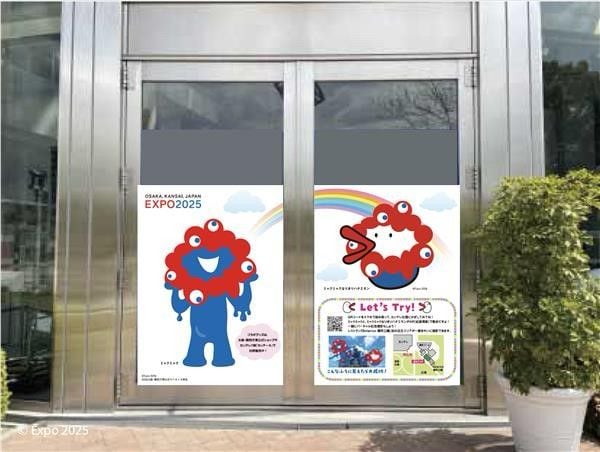 またカンテレ1階アトリウムのガラス面には、「ミャクミャクなりきりハチエモン」とミャクミャクのイラストが登場!