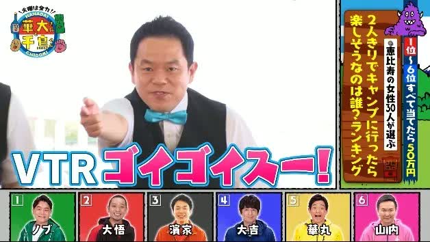 博多華丸・大吉、千鳥(大悟・ノブ)、かまいたち(山内健司、濱家隆一)の6人がスタジオを飛び出してさまざまなランキング予想に挑戦。