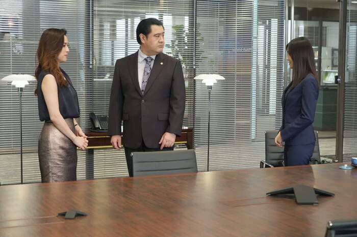 一方、蟹江(小手伸也)は、シニアパートナーの権限で、専属アシスタントを一人雇おうとしていた。東大ロースクールの人事を掌握する真野麻子(MEGUMI)に頼んで卒業生の上位5人を紹介してもらった蟹江は、その中でも自他ともに認める優秀な女性・鮎川依子(恒松祐里)を採用することにする。