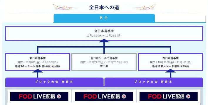 今シーズンは、 FODにて、フィギュアスケート各地方の「ブロック大会」全6大会、「東日本選手権」「西日本選手権」、さらに「全日本ノービス選手権」、「全日本ジュニア選手権」を、LIVE配信することが決定している。