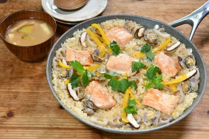 9月26日(日)放送のフジテレビ『くいしん坊!万才』では、SNSで大人気の料理家・ぐっち夫婦の「秋鮭の和風パエリア」が紹介された。