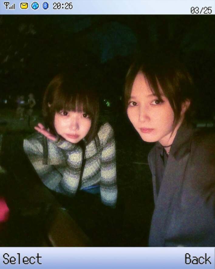 暗闇の中で桜は見えませんが、ジャケット姿の本田さんの隣にはニットのワンピースを着たあのちゃんの姿。2人でカメラを見つめています。
