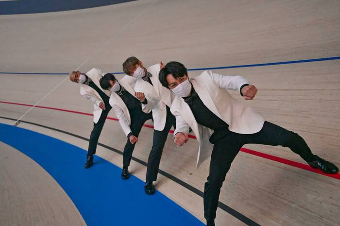 撮影の合間に、ドーム内の木製トラックを実際に歩いた4人。「コンクリートじゃなくて、木なんだ」「でも、転んだら痛そう」と床を触ったり、手すりを伝ってトラックの一番上を歩いたりしながら、選手たちが実際に走るコースを体感した。中でもキャストの皆さんが最も驚いていたのが、普通に立っているのも難しいほどのバンクの急斜面。自転車に乗る体勢を取りながら、「これはもう壁」「こんなに斜めなんだ」「これで自転車乗れるの?」と、プロの凄さを目の当たりにした。それでも次第に斜面のキツさに慣れてくると、4人は自転車に乗るポーズのまま縦一列に並び、メイキング用のカメラに向かって「のっかっとく?」というCMの決めゼリフを披露。続けて、メンディーの口から「斜(なな)メンディー!」というケイリン仕様の決めゼリフ(?)も飛び出した。