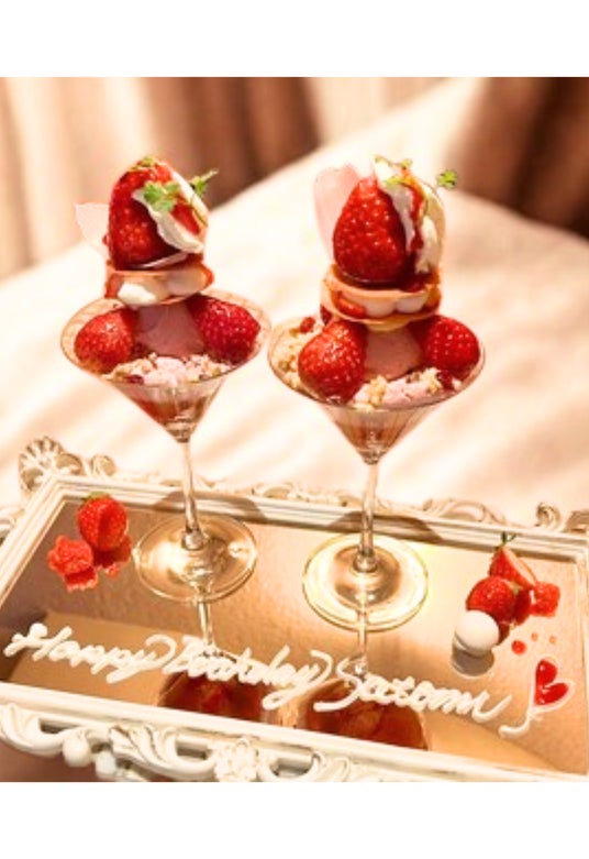 旬のフルーツをふんだんに使用したパフェの下皿はミラープレート仕様。推しのバースデーや周年記念、舞台、ツアー完走のお祝いなど特別なメッセージをプラス。気持ちをそのままプレートに込めて(ハート)(30文字までOK)季節ごとに変わるフルーツパフェと一緒に、推しとの甘い記念日を過ごしませんか?(ハート)