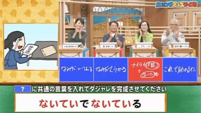 小松みゆきさんは「なみだでけむる」、渡洋史さんは「なみだでうかる」、谷沢健一さんは「これで助かるわ」と解答し不正解。りんさんが正解でした。