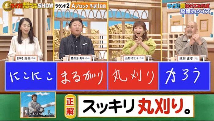 野村真美さんは「にこにこ」、成瀬正孝さんは「かろう」と解答して不正解。舞の海さんと山野さと子さんが正解でした。