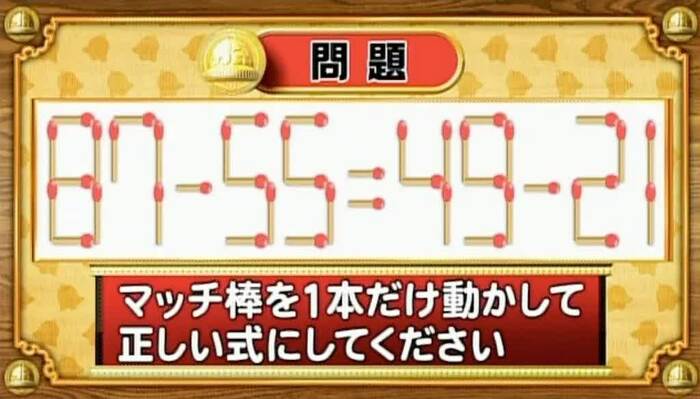 最後は、マッチ棒問題。次の計算式のマッチ棒を1本だけ動かして正しい式にしてください。