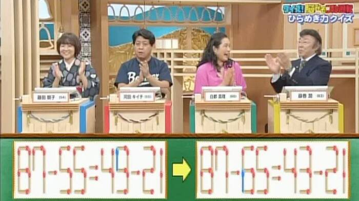 正解は、右の式の「9」の左上のマッチ棒を抜き「43」に。そして、そのマッチ棒を左の式の「55」の十の位の「5」に足して「6」にする。すると「87-65=43-21」となります。藤田さんと白都さんが正解!
