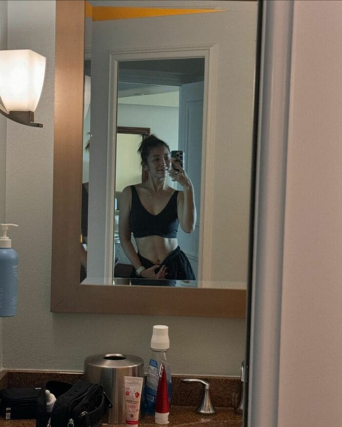 黒のトレーニングウェアを着た姿も。鍛えあげられた美腹筋が目を引きます。