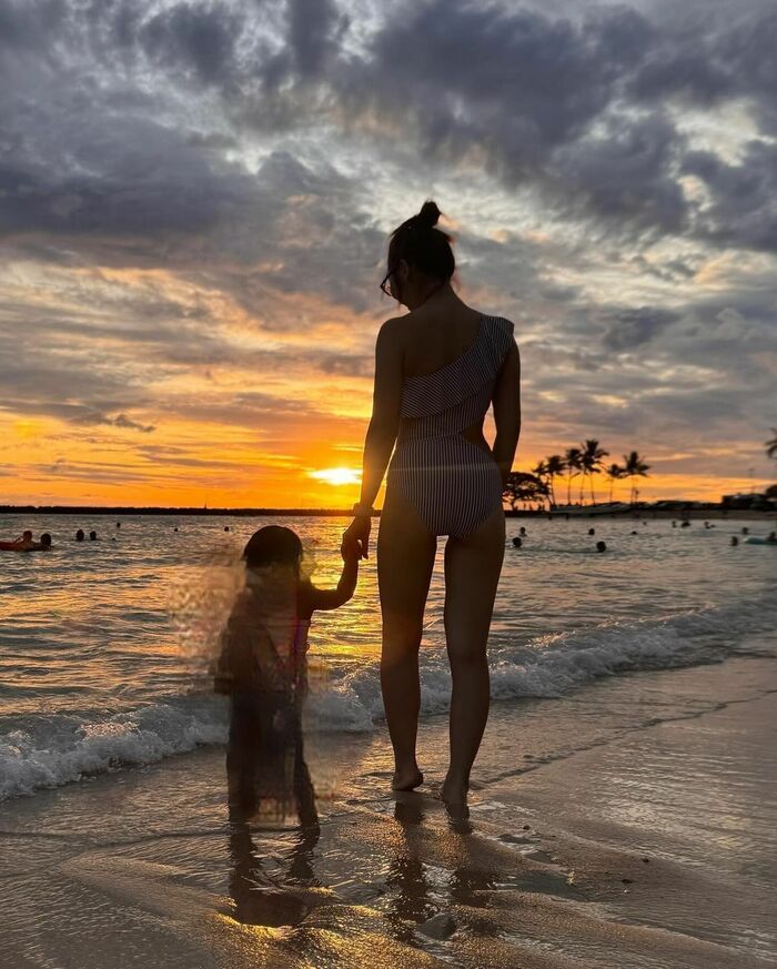他にも、夕日をバックに海辺で水着姿の竹脇さんと、2023年4月に生まれた長女との手つなぎショットも披露。沈んでいく夕日とあいまって、おしゃれな写真です。