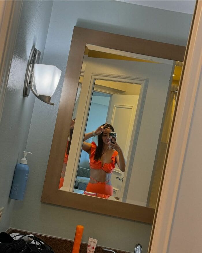 投稿された写真には、オレンジ色の水着姿の竹脇さんが鏡越しに自撮りをする様子や…