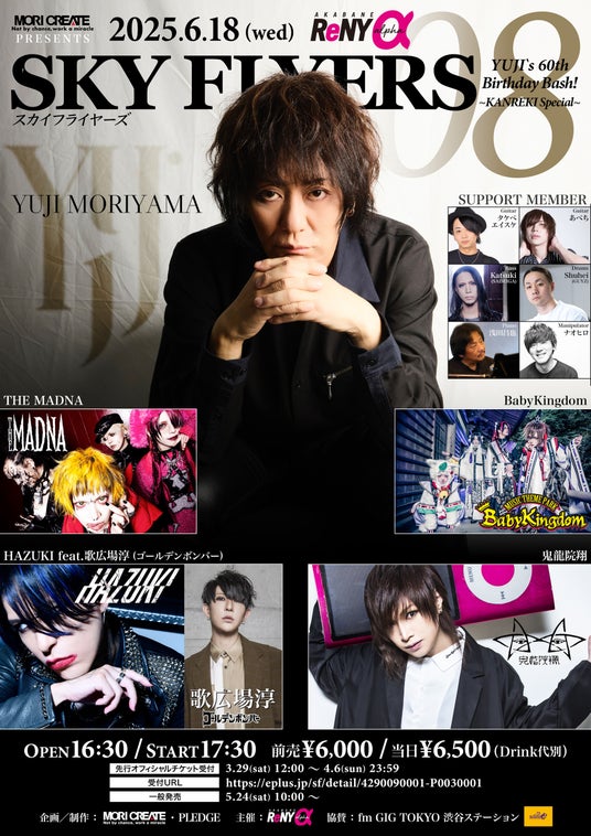 fmGIG TOKYO渋谷ステーションは、ロックシンガー・ボイストレーナーとして多くのアーティストを育成してきたYUJI MORIYAMA (盛山裕治)の還暦を祝うライブイベント『SKY FLYERS 08 YUJI'S 60th Birthday Bash!! ~KANREKI SPECIAL~』を全面的にサポートします。2025年6月18日(水)に赤羽ReNY alphaで開催される本イベントには、YUJI MORIYAMA氏がボイストレーナーとして関わってきた鬼龍院翔(ゴールデンボンバー)やHAZUKI (lynch.)ら豪華アーティストが出演。当日は、fmGIG TOKYO渋谷ステーションのラジオ番組での告知やPR、出演者による番組出演なども予定しており、イベントを盛り上げていきます。