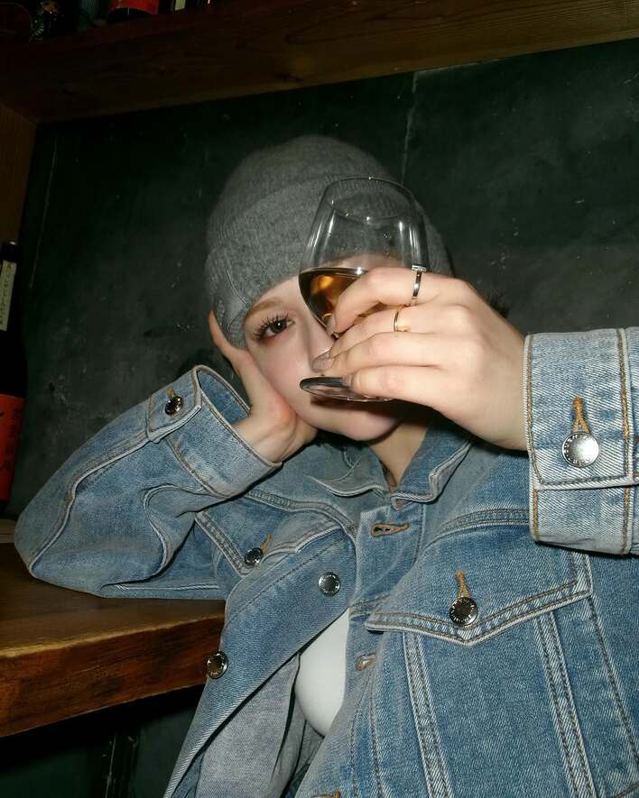 また「相変わらずワイン!」と、オフ感あふれる姿も公開。グレーのニット帽子にデニムを羽織ったコーデで、ワインが入ったグラスを持つショットや…。