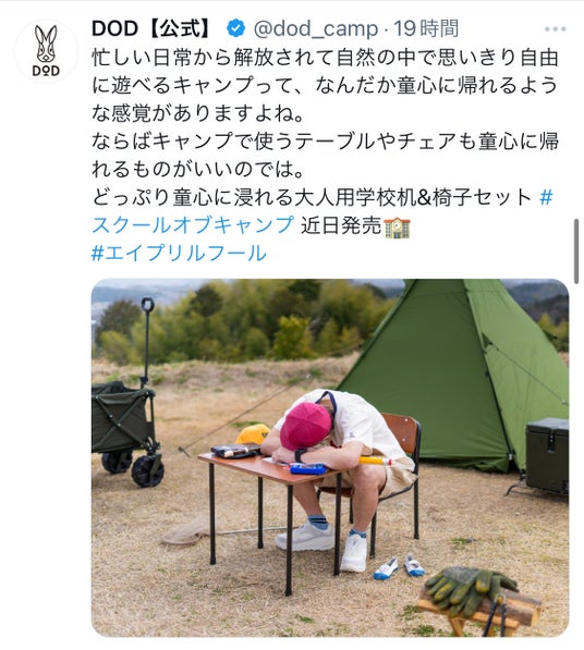 ビーズ株式会社(本社:大阪府東大阪市、代表取締役社長:大上響)が展開するアウトドアブランドの「DOD」は2025年4月1日0時、公式Xアカウントにてキャンプ用の学校机と椅子のセット「スクールオブキャンプ」をエイプリルフール企画として投稿。同日17時より公式EC「DOD STORE」にて本当に発売開始しました。