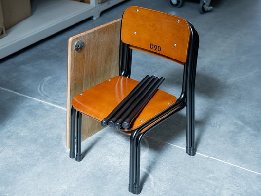 実際の学校用品と同じ素材や構造を採用しつつ、キャンプのロースタイルチェアとしてくつろげるよう大人向けにリサイズ。