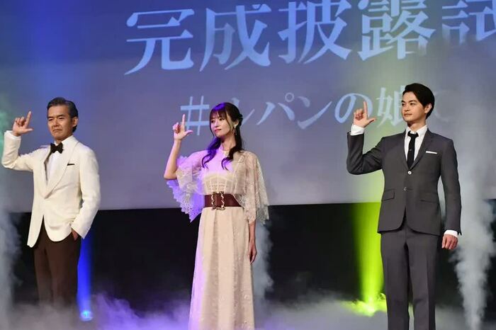 ドラマ版『ルパンの娘』の主題歌であるサカナクションの「モス」が大音量で流れると、登壇者は指でLのマークを作り華麗に登場。