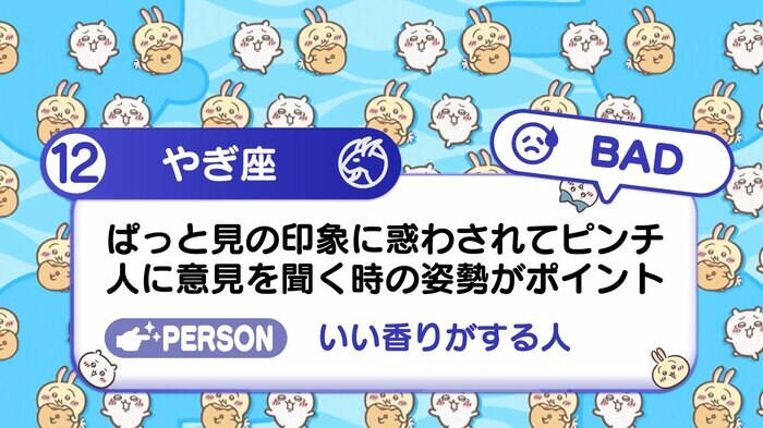 『めざましテレビ』で放送中の「ちいかわ占い」 テレビ放送がない日はお休みで、月~金:朝7時以降/土:朝8時半以降に更新予定です。