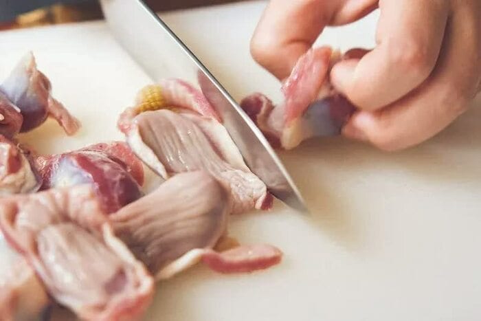 砂肝はコブのようなものが2つ、くっついています。真ん中を切りましょう。