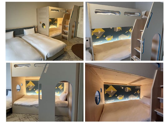 シングルベッド2台の隣に、大人の方もご利用いただける当ホテルオリジナル2段ベッドを新設いたしました。階段下のトンネルや、のぞき穴、水族館らしいお魚の柄の壁紙で、大人も子どももわくわく感をお楽しみいただけます。