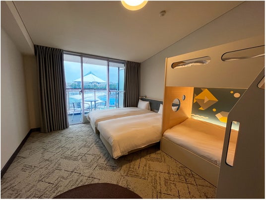 「シーパラルーム」は、海の生きものたちのイラストが描かれた遊び心満載の2段ベッドを新設し、ゆったりとした空間でくつろげるお部屋となっております。お部屋からは、隣接する水族館「ふれあいラグーン」でくらす生きものたちをご覧いただけるほか、シーパラや海の風景に癒されながら、ご家族やご友人などで特別な時間をお過ごしいただけます。