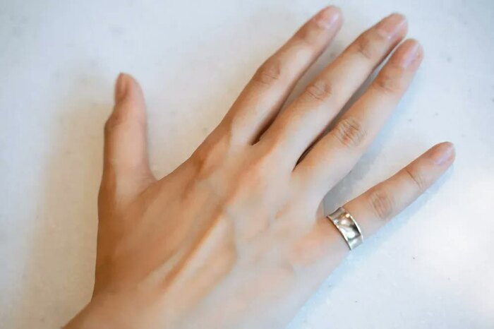 あえて、ちょっと太めだったり、存在感のある指輪を小指につけることが多いですね。今は5個の指輪を使い分けています。今日はめているのは、一番シンプルなものです。洋服がシンプルなので、これが合うかなと思って選んでみました。