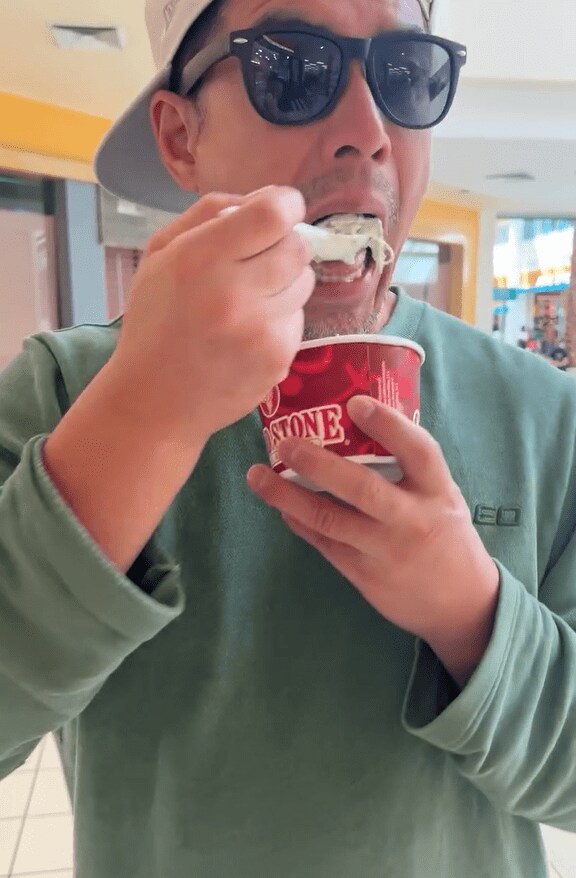 プライベートなのか、キャップにサングラス、ロングスリーブTシャツというラフな格好です。まずは、神妙な面持ちでカップにスプーンを入れ・・・