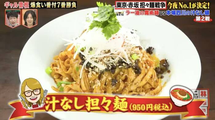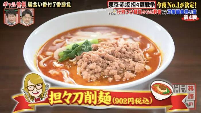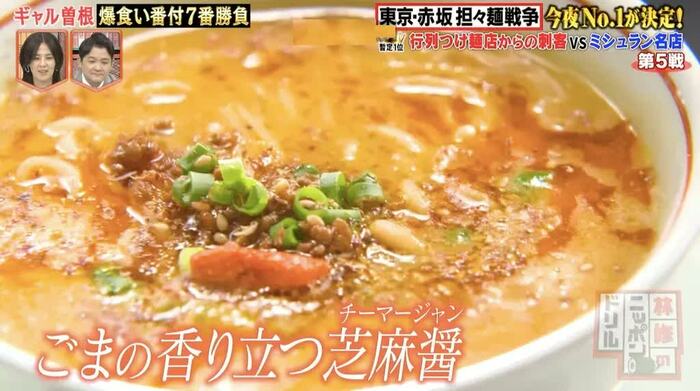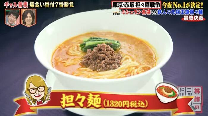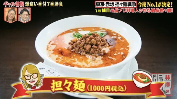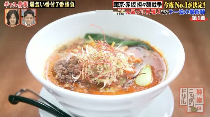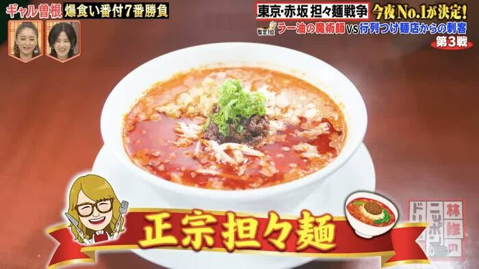 9月16日(水)放送の『林修のニッポンドリル ギャル曽根爆食い番付・赤坂坦々麺編!今夜1位が決定!』では、ギャル曽根が、担々麺を出す店舗が60軒以上集まる東京・赤坂へ。